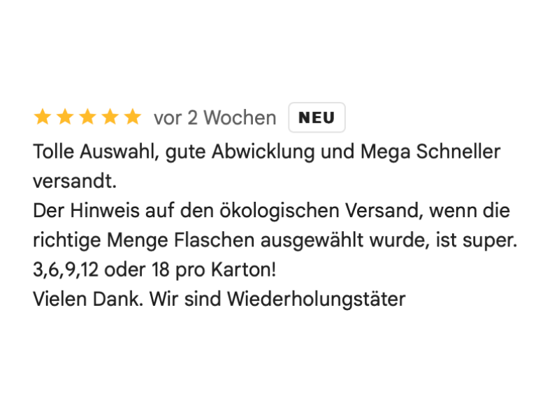 Daher verwenden wir anstatt Kunststoff-Füllmaterialien spezielle Verpackungs-Chips aus Bio-Maisstärke, um deine Flaschen im Karton abzupolstern. Diese kannst du über die Papiertonne entsorgen oder sogar auf deinen Komposthaufen werfen. Und sollte das einmal nicht genug sein, haben wir noch Noppen-Papier als Ersatz für Luftpolsterfolie im Einsatz.