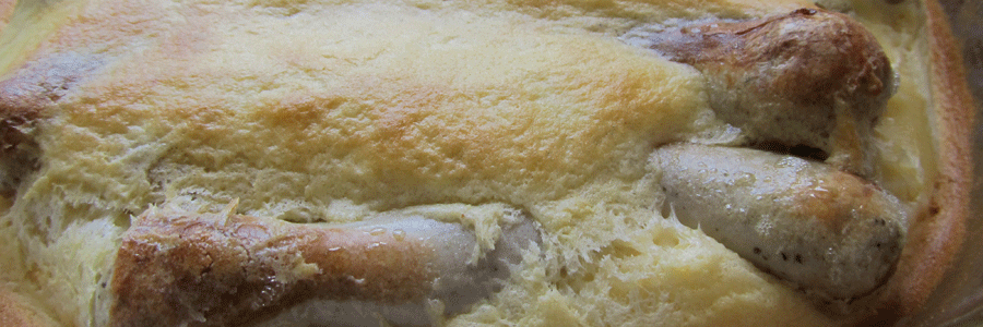 Für den Pfannkuchenteig Milch mit Mehl, Eiern und Salz mit dem Handrührgerät zu einem glatten Teig verarbeiten. Den Pfannkuchenteig über die Schweinsbratwürstl geben und im vorgeheizten Backofen auf der mittleren Einschubleiste bei 200 Grad ca. 25min. backen.